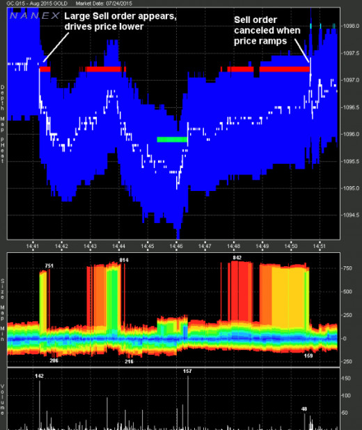 正如Nanex再次展现的,“欺诈”那一刻的举动在卖盘一方。行骗者首先挂出一大笔卖单,然后在下午2点41分以后把金价推低。一旦黄金的实际价格达到行骗者的卖盘价格,他就立即取消之前的挂单,在4点51分大举买入。