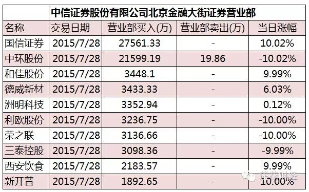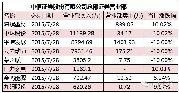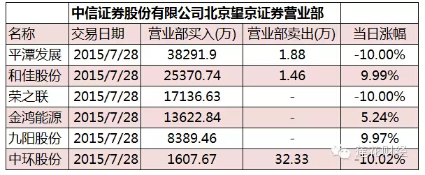 7月27日、7月28日A股再次回调,市场一片哀嚎。28日深交所龙虎榜数据显示,中信证券北京总部证券营业部、中信证券北京望京证券营业部、中信证券北京金融大街证券营业部买入17只个股,合计净买入20.9亿元,买入前五名分别为平潭发展、中环股份[9.98% 资金 研报]、和佳股份[3.48%资金 研报]、国信证券和荣之联[10.00% 资金 研报],买入金额分别为45682.78万元、34259.78万元、28817.35万元、27561.33万元和24070.74万元。
