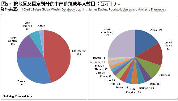 全球中产阶级成年人的数目已由2000年的5.24亿名增加1.4亿名或27%,至2015年的6.64亿名,相当于成年总人口的14%。自2007年高峰期以来,中产阶级成年人的数目已下降13%,上、下财富阶层的成年人则分别增长19%和11%。此外,财富增长重心已倾向于财富水平较高的阶层,富裕阶层的财富自2007年占财富总值增加了5%。上述两项因素令各地区中产阶级所占的财富自2007年起下跌9%至13%。