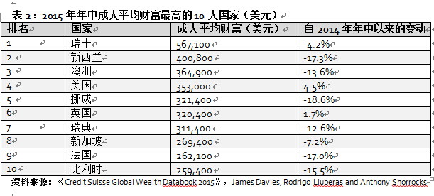 按成人平均财富计算,瑞士仍然是全球最富裕的国家,当地于2015年的成人平均财富为567,100美元,其次为新西兰(400,800美元)和澳洲(364,900美元),美国(353,000美元)排第四,新加坡(269,400美元)排名第八。