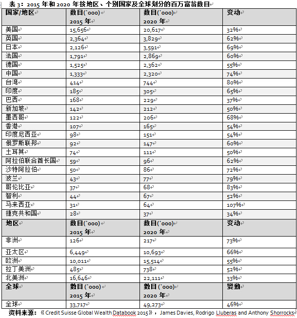 预计到2020年全球百万富翁数量可能超过4,930万,增长逾46.2%,在这些地区中,亚太区和非洲的百万富翁数目增幅将会最高,分别达66%和73%(但后者的基数低),北美洲的百万富翁数目增幅为33%,欧洲为55%。到2020年,亚太区占全球百万富翁的比例将由现时的19%升至22%。