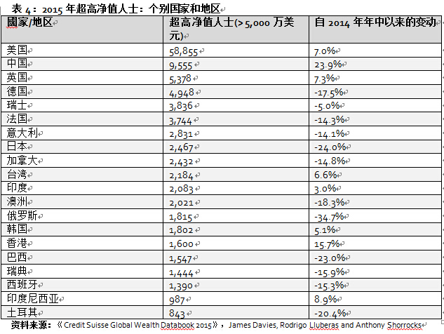 按资产净值算,全球有123,800名个人资产净值超过5,000万美元的超高净值人士,当中44,900人的个人资产值最少达1亿美元,而4,500人的资产值超过5亿美元。强势美元令超高净值人士的数目较2014年年中减少800人;但根据计算,资产值超过5亿美元的人士却轻微增加。