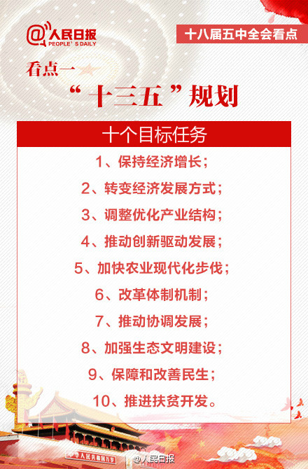 人民日报透露,十三五规划将努力在十个重点方面取得明显突破:1、保持经济增长;2、转变经济发展方式;3、调整优化产业结构;4、推动创新驱动发展;5、加快农业现代化步伐;6、改革体制机制;7、推动协调发展;8、加强生态文明建设;9、保障和改善民生;10、推进扶贫开发。