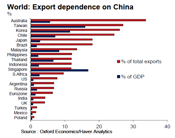 中国经济放缓的最大输家为与中国贸易联系紧密的国家以及最开放的经济体。