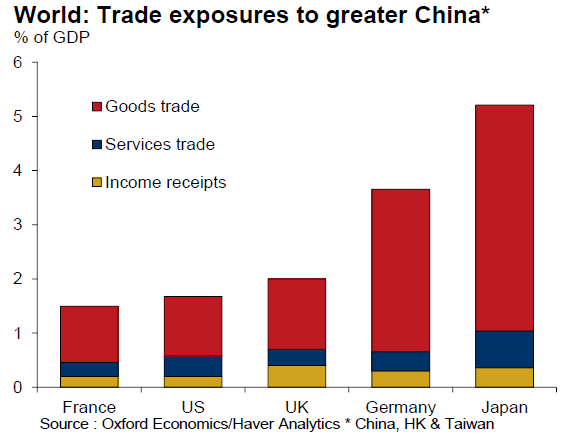 其次,中国经济放缓还导致其贸易伙伴GDP下滑,进而间接影响全球经济。牛津经济研究院研究发现,以日本为例,其不仅会受到对华出口下滑所影响,也会受到受中国经济放缓而受到连累的韩国和其他亚洲贸易伙伴所影响。