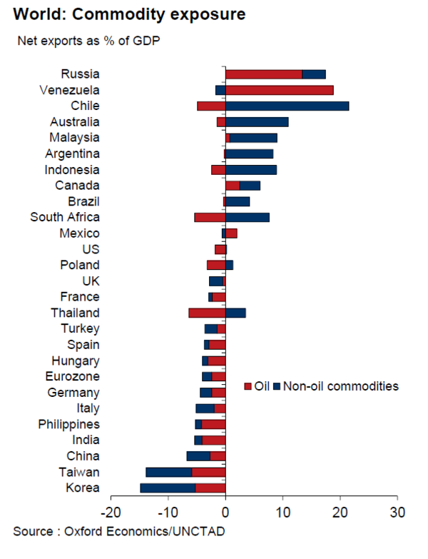 “中国经济放缓在抑制全球经济活动的同时,也会通过商品渠道重新分配全球经济活动,”牛津经济研究院首席经济学家Adam Slater在报告中写道。