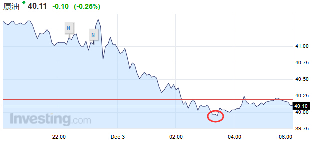 WTI近月期货合约试探每桶40美元,一度触及日内低点39.84美元。