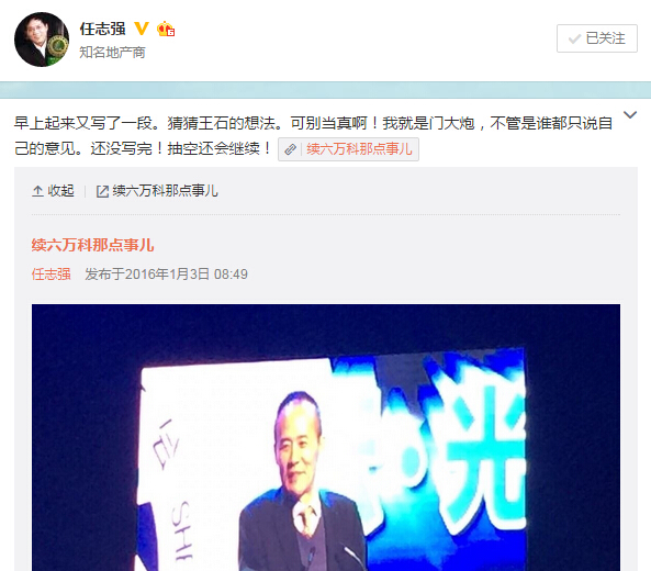 凤凰财经讯 1月2日下午至3日早间,任志强连发六篇微博表示,万科不过是宝能收购的标的物,股东之间的控制权之争是与华润的争夺,任志强在微博表示,有空还会就此继续发文表态。
