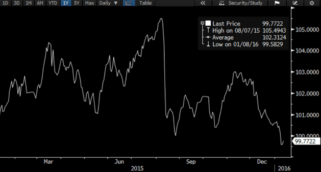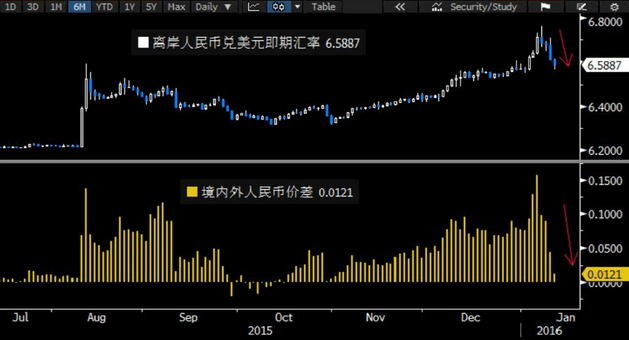 人民币的不断贬值也打击了投资者对人民币资产的兴趣,去年人民币离岸债券发行同比下跌38%。2015年在岸人民币兑美元全年贬值幅度达4.46%,而离岸人民币的贬值幅度更高达5.28%。2016年第一周,离岸人民币大幅贬值,较在岸市场一度贴水达到2000点的纪录水平。