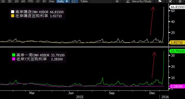 离岸人民币周一触及6.7078的日内低点后,24小时内强力拉升逾1000点,周二亚洲交易时段甚至一度较在岸人民币出现溢价,为去年10月份以来首见。周二香港人民币隔夜银行间拆借利率飙升至66.8%,达到有数据以来的纪录最高位,显示流动性已经极度紧张。自2013年6月推出以来,该市场的人民币银行同业隔夜拆息定价平均位于2.57%左右。