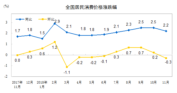 2018年11月份,全国居民消费价格同比上涨2.2%。其中,城市上涨2.2%,农村上涨2.2%;食品价格上涨2.5%,非食品价格上涨2.1%;消费品价格上涨2.2%,服务价格上涨2.1%。1-11月平均,全国居民消费价格比去年同期上涨2.1%。