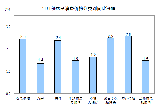 其他七大类价格同比均上涨。其中,医疗保健、教育文化和娱乐价格分别上涨2.6%和2.5%,居住、交通和通信价格分别上涨2.4%和1.6%,生活用品及服务、其他用品和服务、衣着价格分别上涨1.5%、1.5%和1.4%。