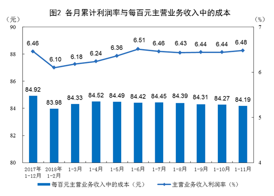 1-11月份,规模以上工业企业实现主营业务收入94.4万亿元,同比增长9.1%;发生主营业务成本79.5万亿元,增长8.8%;主营业务收入利润率为6.48%,同比提高0.16个百分点。