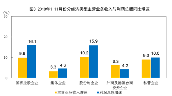 1-11月份,规模以上工业企业中,国有控股企业实现利润总额18087亿元,同比增长16.1%;集体企业实现利润总额191.5亿元,增长4.6%;股份制企业实现利润总额43176.8亿元,增长15.9%;外商及港澳台商投资企业实现利润总额15386.8亿元,增长4.2%;私营企业实现利润总额15815.5亿元,增长10%。