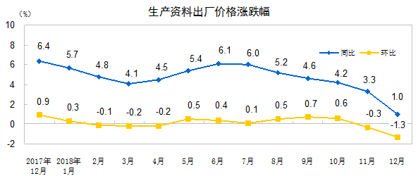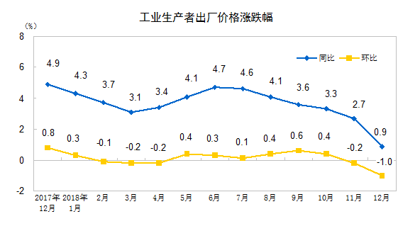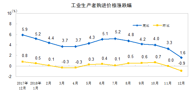 2018年12月份,全国工业生产者出厂价格同比上涨0.9%,环比下降1.0%;工业生产者购进价格同比上涨1.6%,环比下降0.9%。全年工业生产者出厂价格比上年上涨3.5%,工业生产者购进价格上涨4.1%。