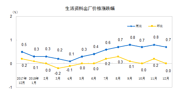12月份生产资料价格同比上涨1.0%,影响工业生产者出厂价格总水平上涨约0.75个百分点。其中,采掘工业价格上涨3.8%,原材料工业价格上涨0.8%,加工工业价格上涨0.8%。生活资料价格同比上涨0.7%,影响工业生产者出厂价格总水平上涨约0.16个百分点。其中,食品价格上涨0.9%,衣着价格上涨1.6%,一般日用品价格上涨0.4%,耐用消费品价格上涨0.2%。