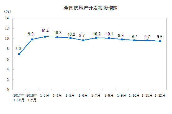 2018年1-12月,全国房地产开发投资120264亿元,比上年增长9.5%,增速比1-11月份回落0.2个百分点,比上年同期提高2.5个百分点。其中,住宅投资85192亿元,增长13.4%,比1-11月份回落0.2个百分点,比上年提高4个百分点。住宅投资占房地产开发投资的比重为70.8%。