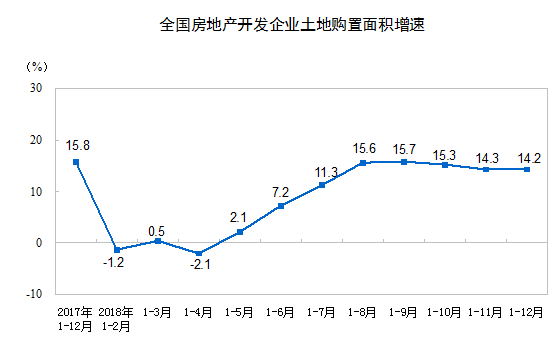 2018年,房地产开发企业土地购置面积29142万平方米,比上年增长14.2%,增速比1-11月份回落0.1个百分点,比上年回落1.6个百分点;土地成交价款16102亿元,增长18.0%,比1-11月份回落2.2个百分点,比上年回落31.4个百分点。