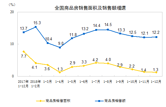 2018年,商品房销售面积171654万平方米,比上年增长1.3%,增速比1-11月份回落0.1个百分点,比上年回落6.4个百分点。其中,住宅销售面积增长2.2%,办公楼销售面积下降8.3%,商业营业用房销售面积下降6.8%。商品房销售额149973亿元,增长12.2%,比1-11月份提高0.1个百分点,比上年回落1.5个百分点。其中,住宅销售额增长14.7%,办公楼销售额下降2.6%,商业营业用房销售额增长0.7%。