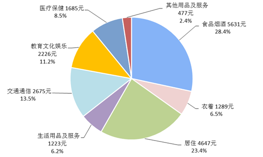 全年全国居民人均食品烟酒消费支出5631元,比上年增长4.8%,占人均消费支出的比重为28.4%;人均衣着消费支出1289元,增长4.1%,占人均消费支出的比重为6.5%;人均居住消费支出4647元,增长13.1%,占人均消费支出的比重为23.4%;人均生活用品及服务消费支出1223元,增长9.1%,占人均消费支出的比重为6.2%;人均交通通信消费支出2675元,增长7.1%,占人均消费支出的比重为13.5%;人均教育文化娱乐消费支出2226元,增长6.7%,占人均消费支出的比重为11.2%;人均医疗保健消费支出1685元,增长16.1%,占人均消费支出的比重为8.5%;人均其他用品及服务消费支出477元,增长6.8%,占人均消费支出的比重为2.4%。