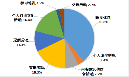 调查结果(详见附表1)显示,居民在一天的活动中,个人生理必需活动平均用时11小时53分钟,占全天的49.5%;有酬劳动平均用时4小时24分钟,占18.3%;无酬劳动平均用时2小时42分钟,占11.3%;个人自由支配活动平均用时3小时56分钟,占16.4%;学习培训平均用时27分钟,占1.9%;交通活动平均用时38分钟,占2.7%(见图1)。
