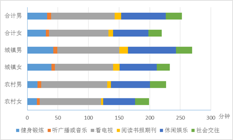 休闲娱乐时间。居民休闲娱乐的平均时间为1小时5分钟。其中,男性1小时13分钟,女性58分钟;城镇居民1小时9分钟,农村居民58分钟;工作日58分钟,休息日1小时23分钟。居民休闲娱乐的参与率为40.7%,其中城镇居民43.5%,农村居民36.2%。