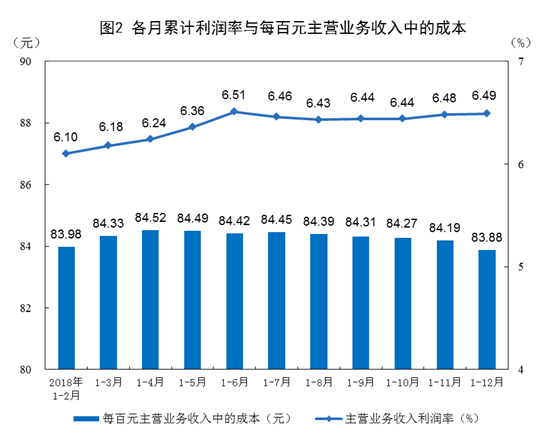 2018年,规模以上工业企业实现主营业务收入102.2万亿元,比上年增长8.5%;发生主营业务成本85.7万亿元,增长8.3%;主营业务收入利润率为6.49%,比上年提高0.11个百分点。