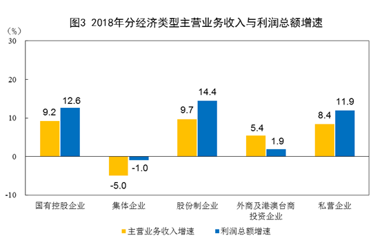 2018年,规模以上工业企业中,国有控股企业实现利润总额18583.1亿元,比上年增长12.6%;集体企业实现利润总额102.2亿元,下降1%;股份制企业实现利润总额46975.1亿元,增长14.4%;外商及港澳台商投资企业实现利润总额16775.5亿元,增长1.9%;私营企业实现利润总额17137亿元,增长11.9%。