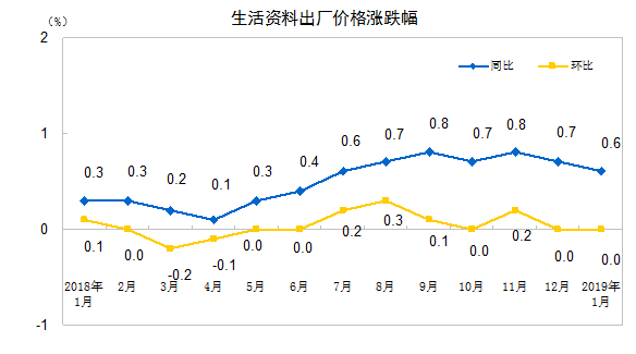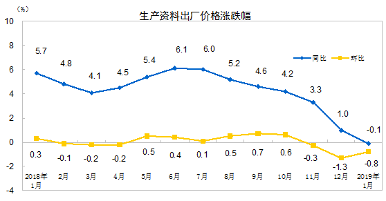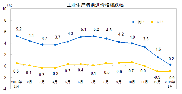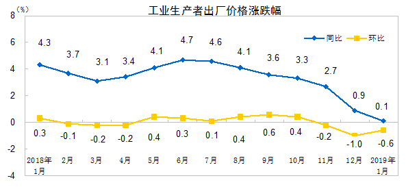 2019年1月份,全国工业生产者出厂价格同比上涨0.1%,环比下降0.6%;工业生产者购进价格同比上涨0.2%,环比下降0.9%。