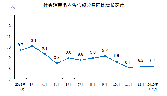 2019年1-2月份,社会消费品零售总额66064亿元,同比名义增长8.2%。其中,限额以上单位消费品零售额23096亿元,增长3.5%。