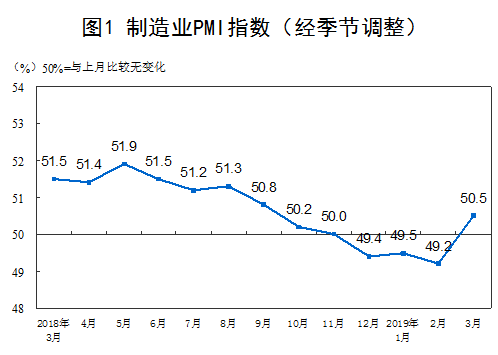 2019年3月份,中国制造业采购经理指数(PMI)为50.5%,比上月上升1.3个百分点,重回临界点以上。