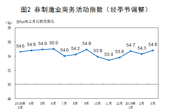 2019年3月份,中国非制造业商务活动指数为54.8%,比上月上升0.5个百分点,表明非制造业总体保持平稳较快增长。