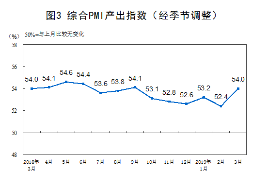 2019年3月份,综合PMI产出指数为54.0%,比上月上升1.6个百分点,表明我国企业生产经营活动总体扩张加快。
