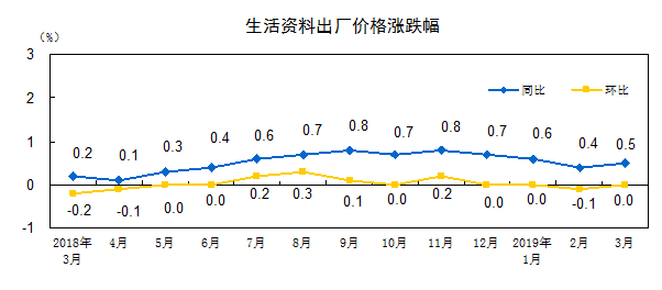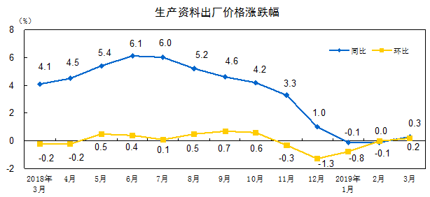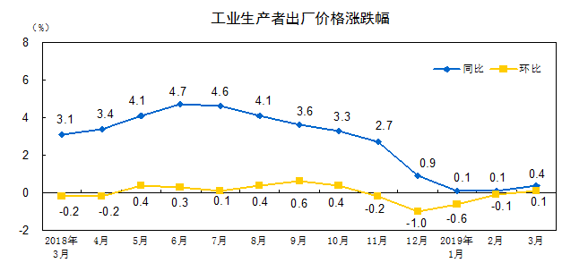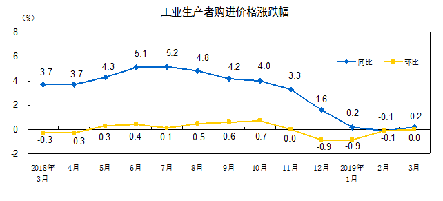 2019年3月份,全国工业生产者出厂价格同比上涨0.4%,环比上涨0.1%;工业生产者购进价格同比上涨0.2%,环比持平。一季度,工业生产者出厂价格比去年同期上涨0.2%,工业生产者购进价格上涨0.1%。