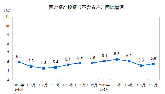 2019年1—6月份,全国固定资产投资(不含农户)299100亿元,同比增长5.8%,增速比1—5月份提高0.2个百分点。从环比速度看,6月份固定资产投资(不含农户)增长0.44%。其中,民间固定资产投资180289亿元,同比增长5.7%,增速比1—5月份提高0.4个百分点。