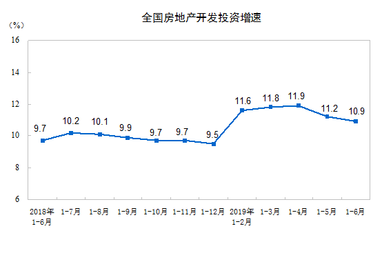 2019年1—6月份,全国房地产开发投资61609亿元,同比增长10.9%,增速比1—5月份回落0.3个百分点。其中,住宅投资45167亿元,增长15.8%,增速回落0.5个百分点。住宅投资占房地产开发投资的比重为73.3%。