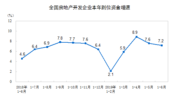 1—6月份,房地产开发企业到位资金84966亿元,同比增长7.2%,增速比1—5月份回落0.4个百分点。其中,国内贷款13330亿元,增长8.4%;利用外资43亿元,增长51.8%;自筹资金26731亿元,增长4.7%;定金及预收款28465亿元,增长9.0%;个人按揭贷款12806亿元,增长11.1%。