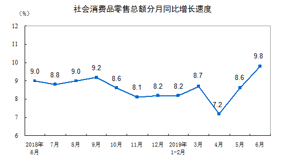 2019年上半年,社会消费品零售总额195210亿元,同比名义增长8.4%(扣除价格因素实际增长6.7%,以下除特殊说明外均为名义增长)。其中,6月份社会消费品零售总额33878亿元,同比增长9.8%。