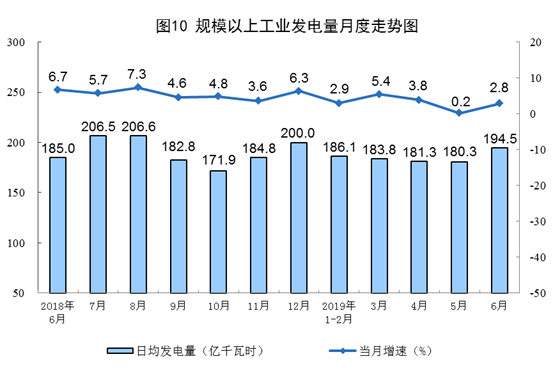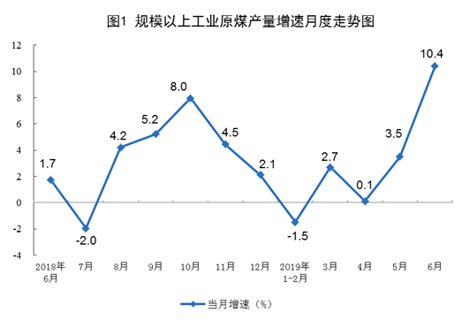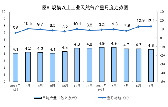 6月份,规模以上工业原煤、天然气、电力生产均加快增长,原油生产稳定。