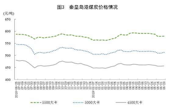 煤炭价格小幅下跌。6月28日,秦皇岛5500大卡煤炭综合交易价格为每吨580元,5000大卡为每吨513元,4500大卡为每吨457元,比5月31日分别下跌8元、2元和2元。
