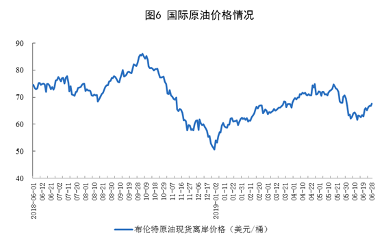 国际原油价格有所上涨。6月28日,布伦特原油现货离岸价格为67.5美元/桶,比5月31日上涨0.7美元。
