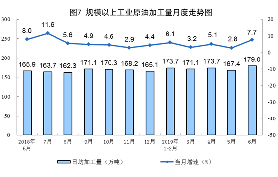 6月份,加工原油5370万吨,同比增长7.7%,增速比上月加快4.9个百分点;日均加工179.0万吨,比上月增加11.6万吨。上半年,加工原油31697万吨,同比增长5.8%。