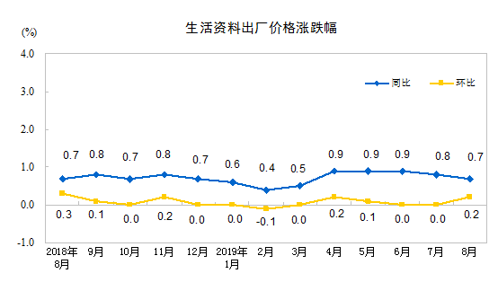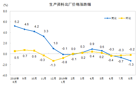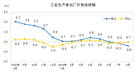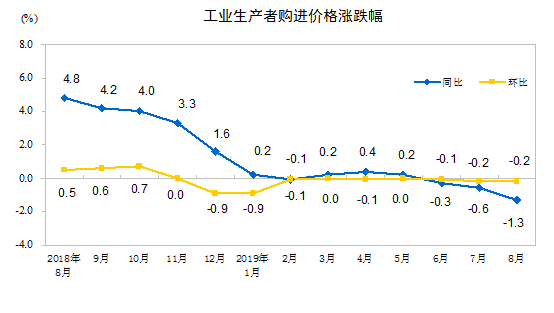 2019年8月份,全国工业生产者出厂价格同比下降0.8%,环比下降0.1%;工业生产者购进价格同比下降1.3%,环比下降0.2%。1—8月平均,工业生产者出厂价格比去年同期上涨0.1%,工业生产者购进价格下降0.2%。