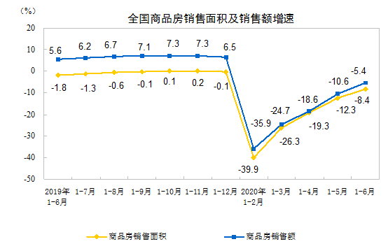 1—6月份,商品房销售面积69404万平方米,同比下降8.4%,降幅比1—5月份收窄3.9个百分点。其中,住宅销售面积下降7.6%,办公楼销售面积下降26.5%,商业营业用房销售面积下降20.7%。商品房销售额66895亿元,下降5.4%,降幅比1—5月份收窄5.2个百分点。其中,住宅销售额下降2.8%,办公楼销售额下降28.0%,商业营业用房销售额下降25.5%。
