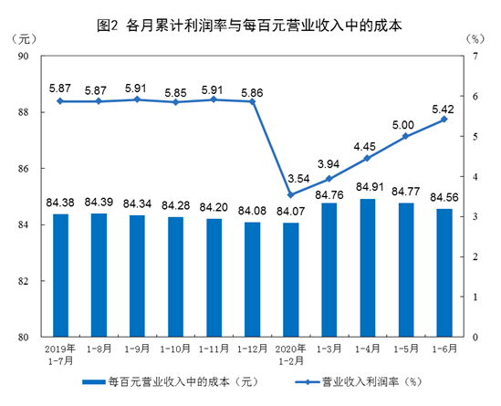 1—6月份,规模以上工业企业每百元营业收入中的成本为84.56元,同比增加0.42元;每百元营业收入中的费用为9.05元,同比增加0.23元。