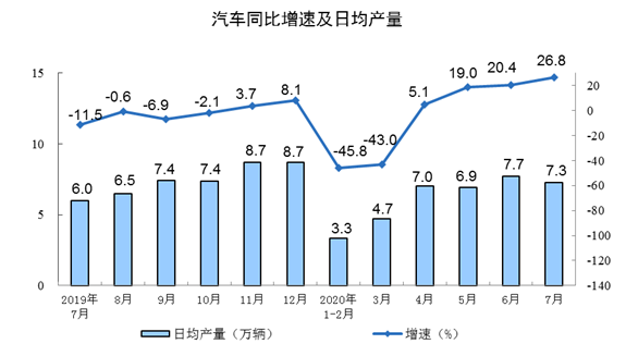 分行业看,7月份,41个大类行业中有25个行业增加值保持同比增长。农副食品加工业下降2.2%,纺织业增长0.7%,化学原料和化学制品制造业增长4.7%,非金属矿物制品业增长3.1%,黑色金属冶炼和压延加工业增长7.9%,有色金属冶炼和压延加工业增长2.6%,通用设备制造业增长9.6%,专用设备制造业增长10.2%,汽车制造业增长21.6%,铁路、船舶、航空航天和其他运输设备制造业下降1.4%,电气机械和器材制造业增长15.6%,计算机、通信和其他电子设备制造业增长11.8%,电力、热力生产和供应业增长1.7%。